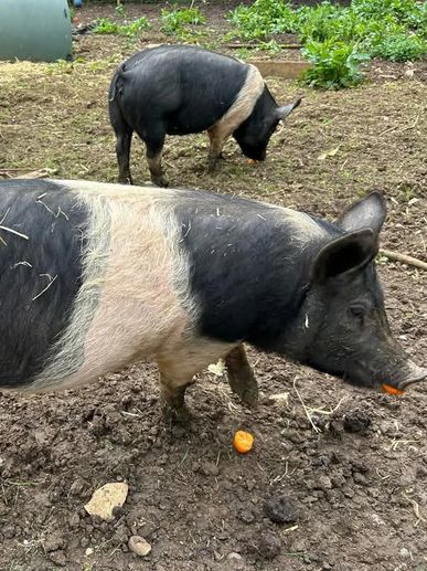 They arrived on the farm in May 2024 as tiny piglets. Not so small now, they enjoy their muddy sty next to the chickens.
